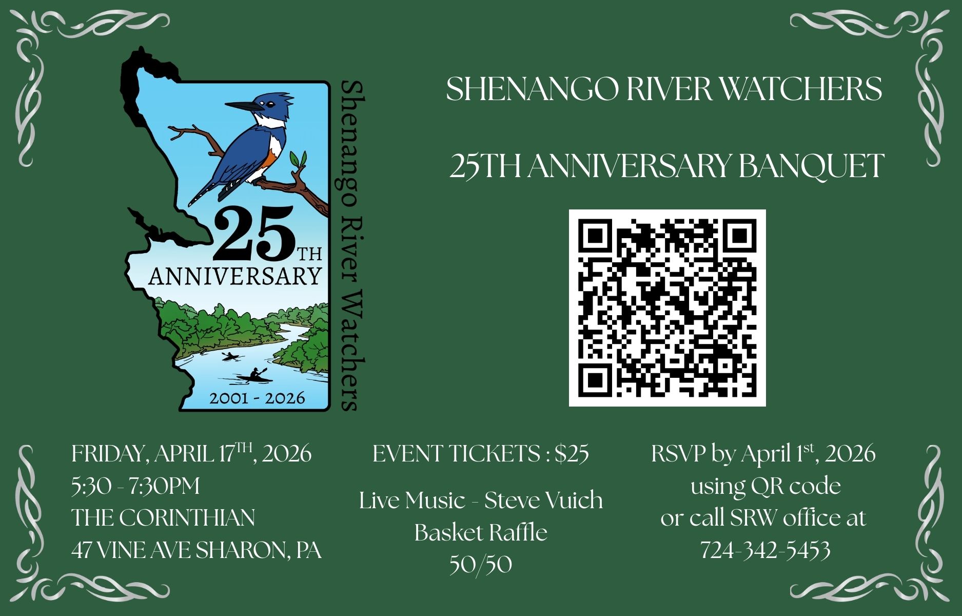 Please join us for a night of celebration and friendship – to see where Shenango River Watchers has been and to envision where we are going! Purchase tickets using the QR code or the link below. The event location is The Corinthian at 47 Vine Avenue, Sharon, PA. Parking garage is across the street and free. Tickets are available for $25 until April 1st.